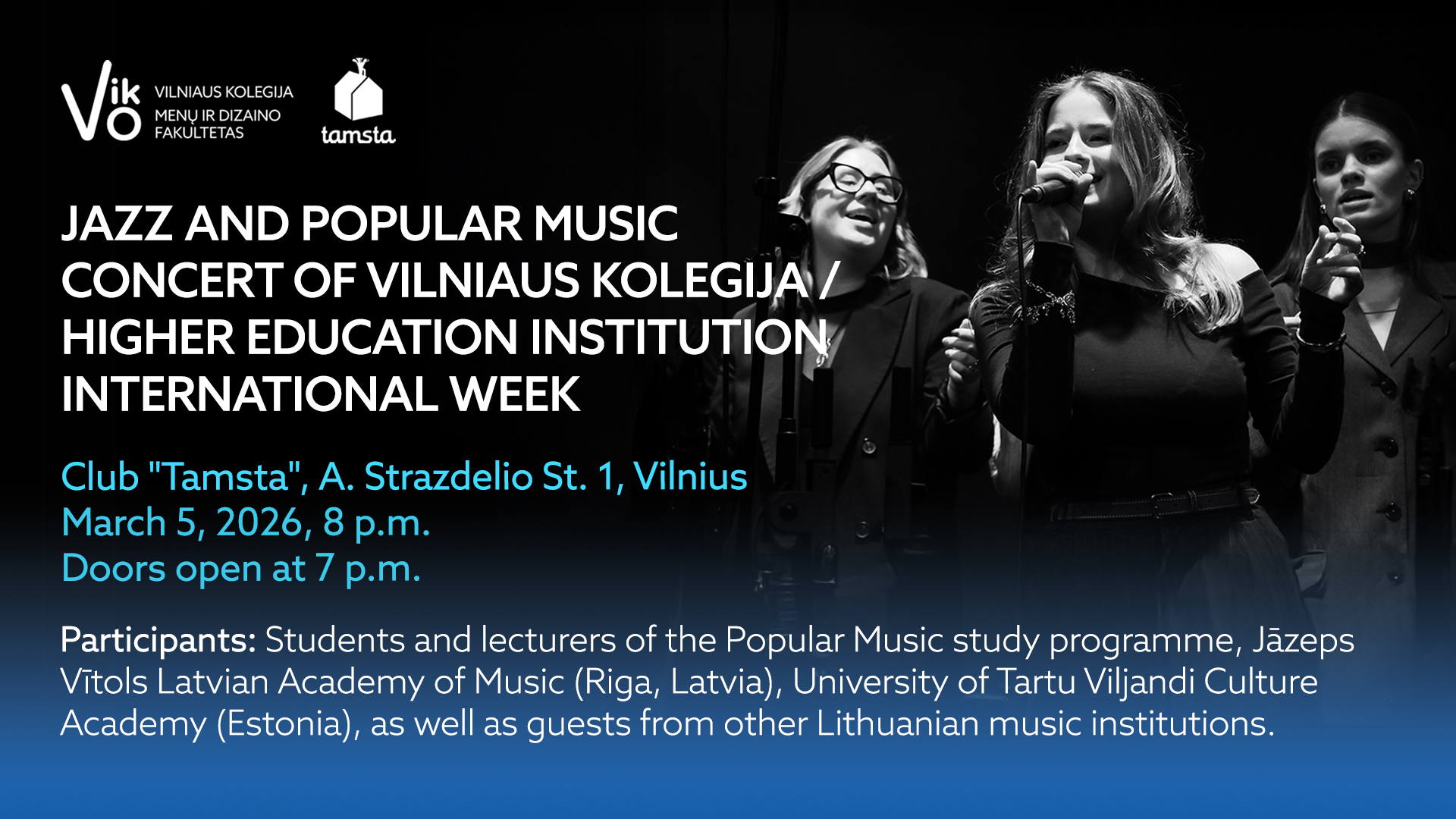 The concert will feature students and lecturers from Vilniaus kolegija / HEI Popular Music programme, as well as representatives from Latvia (Riga, JVLMA), Estonia (Viljandi Culture Academy), and guests from other Lithuanian music institutions.